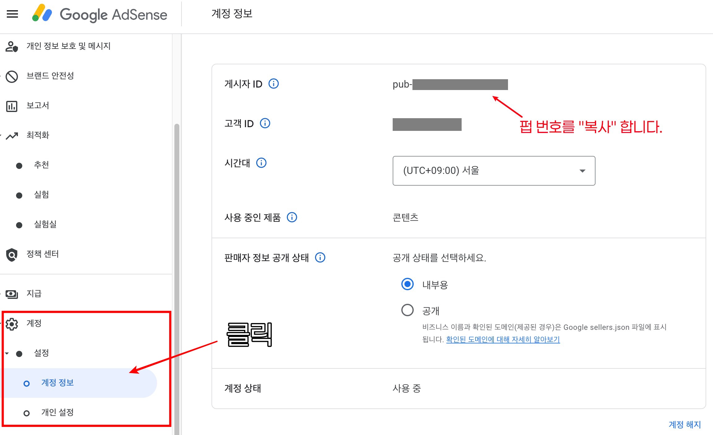 1. 애드 센스 계정으로 접속해서 계정 → 설정 → 계정정보에 있는 펍번호를 복사합니다.