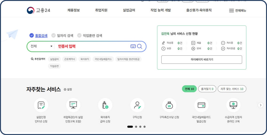 ① 검색창에 "인증서" 라고 입력해서 인증서 등록.(카드발급 신청은 공인인증서 필수!)