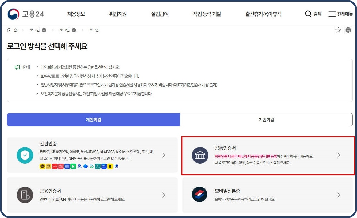 1) 공동인증서 등록이 완료되면 공동인증서로 로그인을 합니다.