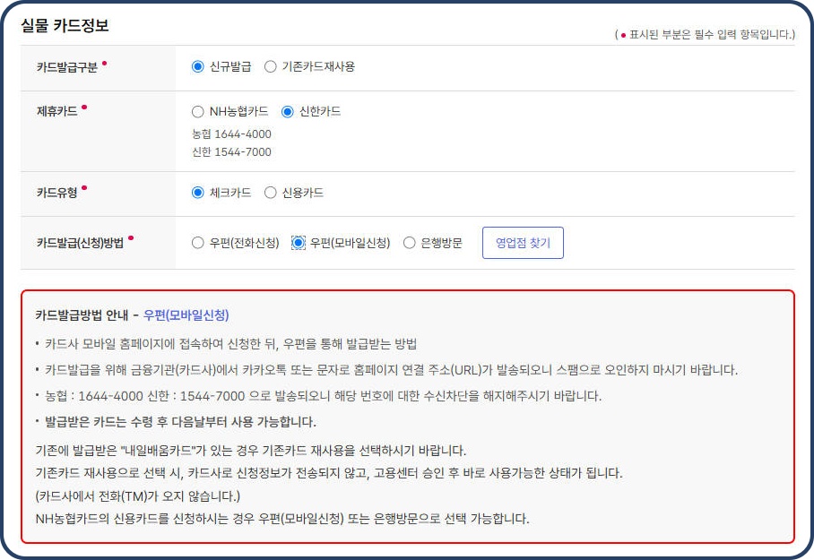 신청은 신한, 농협카드로 가능하며 내일배움카드 신청 후, ‘마이페이지’ 메뉴에서 신청내역을 확인 할 수 있습니다.