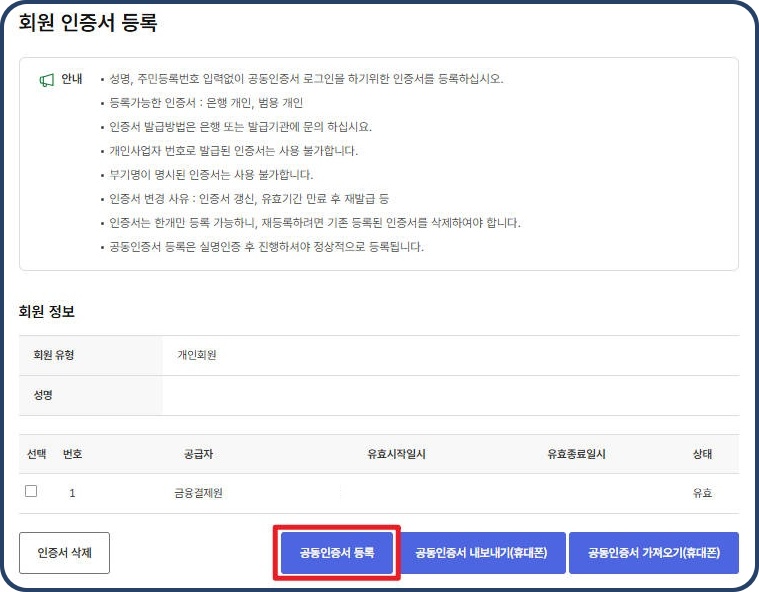 ③  회원 인증서 등록 - 공동인증서 등록을 통해 등록합니다.