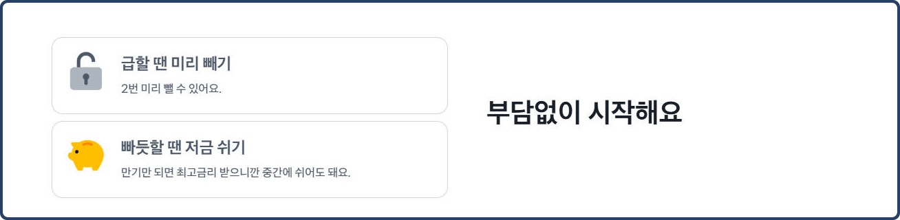 - 유연한 저축: 중간에 저금을 쉬어도 최고 금리에 영향 없음