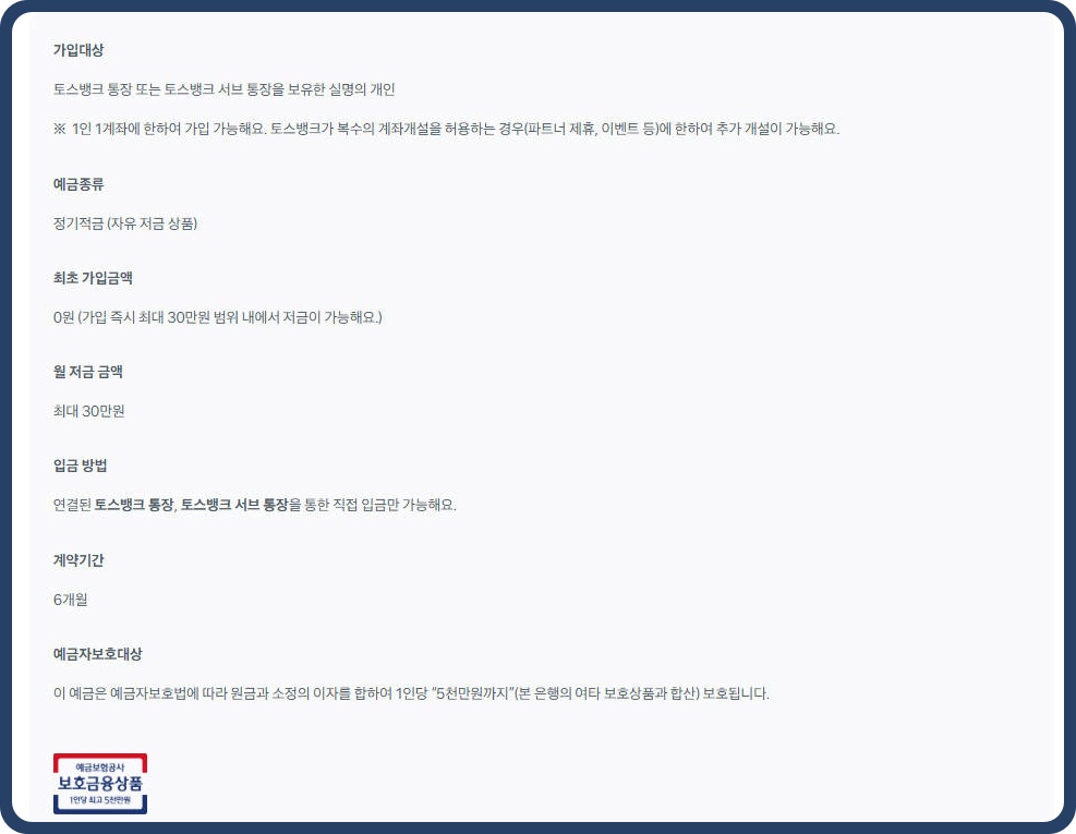 가입은 토스앱을 통해 간편하게 진행할 수 있으며, 최초 가입 시 입금액은 0원입니다. 가입 즉시 최대 30만원 범위 내에서 저금이 가능하므로, 원하는 시점에 자유롭게 저금을 시작할 수 있습니다.