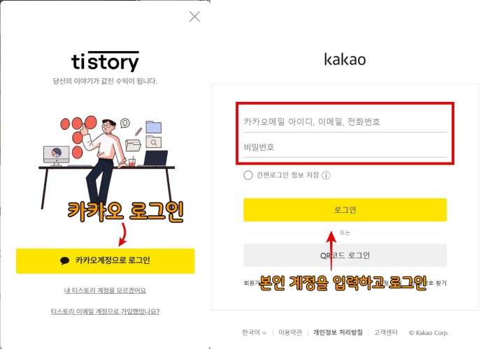 - 카카오 계정: 티스토리는 카카오 계정으로 로그인해야 합니다.